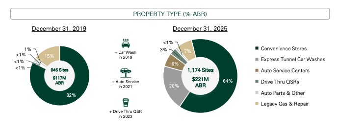 Brian Dickman, CFO, explicou que cerca de 80% dos $100 milhões, consiste em propriedades de serviço automotivo, incluindo centros de colisão e locais de troca de óleo, com o restante em GNV, drive-throughs e lavagens de carros.