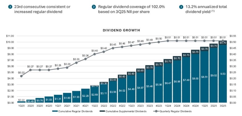 Com um portfólio diversificado de cerca de US$ 2,2 bilhões, ela oferece alto rendimento (yield em torno de 13-14%) e cobertura sólida de dividendos via NII, destacando-se por crescimento acelerado do portfólio, baixo nível de non-accruals e transição para dividendos mensais a partir de janeiro/2026.