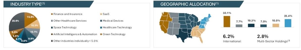 Estrutura de portfólio bem conservadora — no segmento de dívida, com 77,2% alocados em Senior First Lien (empréstimos sênior de primeira linha, que oferecem maior prioridade em caso de inadimplência), 13,9% em Sub Lien (dívidas subordinadas) e 8,9% em Equity (participações acionárias e warrants).