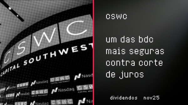 Vejo CSWC como a BDC mais bem posicionada para evitar corte de dividendos, graças a baixa alavancagem, liquidez robusta, maturities de dívida bem escalonadas e equity investments que dão flexibilidade contra cortes de juros.