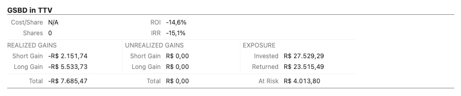 Compramos GSBD em setembro de 2024 junto com outros ativos a BDC desde então investimos R$ 27 mil na empresa e saímos da posição com R$ 23 mil, isso foi um prejuízo de R$ 4 mil nesta BDC.